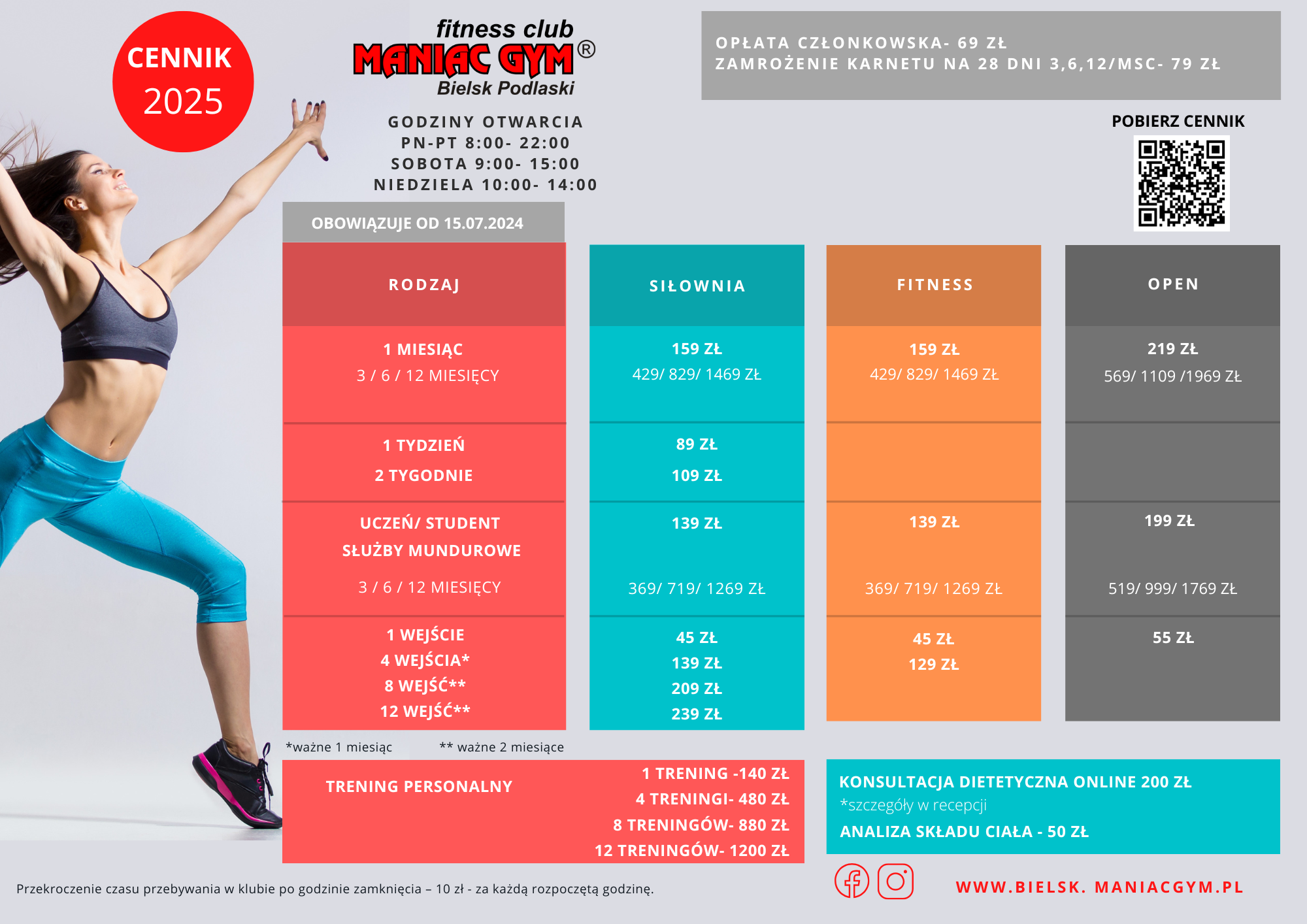 Aktualny cennik Maniac Gym Bielsk Podlaski